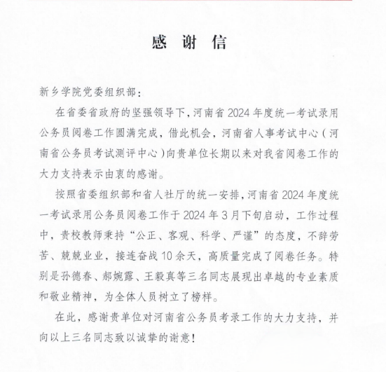 近日,河南省人事考试中心(河南省公务员考试测评中心)为太阳集团组织部发来感谢信,对太阳集团长期以来对我省公务员考试阅卷工作的积极支持,以及太阳集团相关教师的辛苦工作和优秀表现表示感谢。