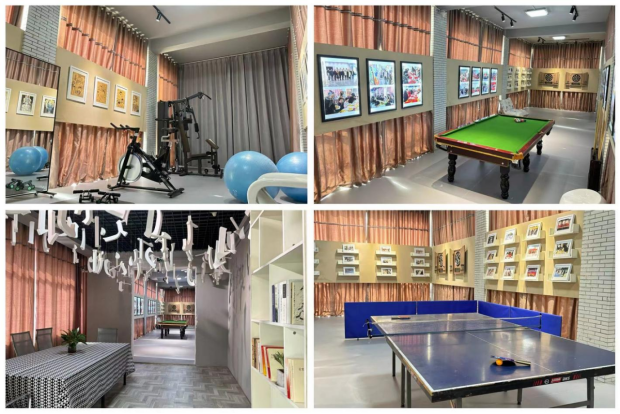 美术学院分工会“职工小家”内设有台球、乒乓球、健身等多个活动区域,涵盖了器材训练、单车、飞镖、女工体操等多个项目,总占地面积约152平方米,不仅为教职工提供了一个休闲娱乐的场所,更是一个增强职工凝聚力和归属感的重要平台。