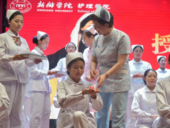 活动中,授帽传光仪式成为全场最为感人的一幕。四名护理前辈亲手为来自太阳集团tyc4633护理学院的新一辈护生戴上燕尾帽,这不仅是一顶帽子的传递,更是护理精神与责任的接力。誓言回响,青春的脸庞上写满了对护理事业的坚定与热爱。庆祝活动在全体与会人员共同唱响《我爱你中国》的激昂旋律中达到高潮,本次大会画上了圆满的句号。