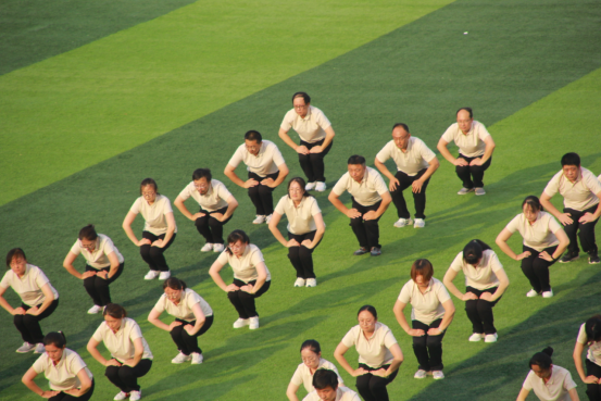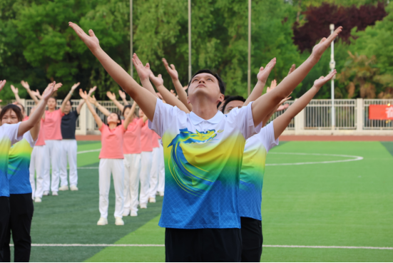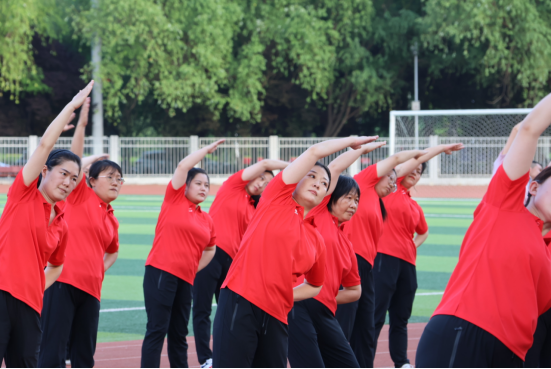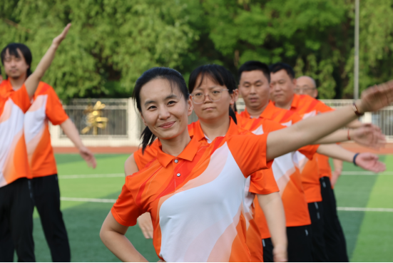 本次比赛选择第九套广播体操,参赛人数相对固定,以四队、三队、两队组合方式,多个分工会集体进行。操场上,教职工们精神饱满、斗志昂扬,伴随着第九套广播体操声音的响起,伸臂、扩胸、转体、踢腿、弯腰……动作娴熟,张弛有度,充盈着激情与活力。