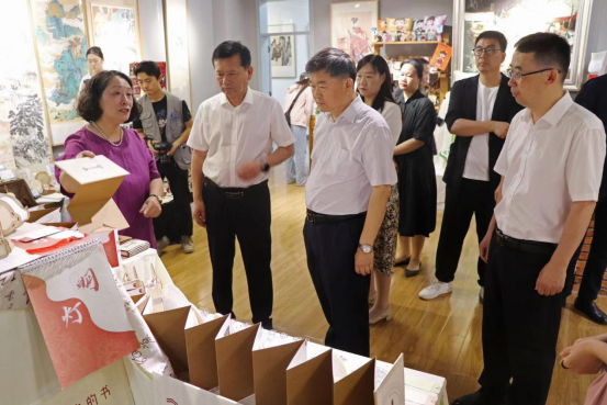 开幕式后,与会领导参观了油画、国画、版画、环艺建筑模型、视觉传达产品与动画短片及周边文创等多个作品展区,与同学们亲切交流互动,认真听取同学们的创作理念和心路历程,并参与体验非物质文化遗产漆扇制作过程,感受传统文化魅力。