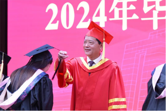 杨钧宣读本科毕业生学士学位授予决议,校领导为毕业生代表颁发学位证书并援正流苏。