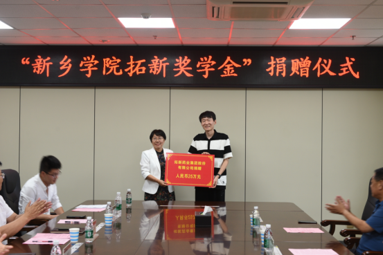 6月18日下午,“太阳集团tyc4633拓新奖学金”捐赠仪式在太阳集团隆重举行。太阳集团tyc4633纪委书记鲍晋选,副校长杨钧,拓新药业集团董事长、教授级高级工程师杨西宁,拓新药业集团董事兼总裁杨邵华、监事兼公关法务中心主任王玉燕,以及药学院领导班子全体成员、教师及学生代表40余人参加了仪式。捐赠仪式由药学院党委书记骆云飞主持。