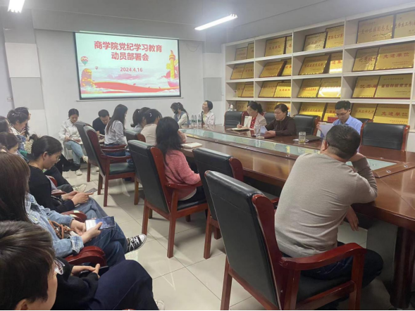 4月16日下午,商学院召开党纪学习教育动员部署会,传达学习习近平总书记关于党纪学习教育的重要讲话精神、《中共中央办公厅关于在全党开展党纪学习教育的通知》和学校有关会议精神,对商学院党纪学习教育工作进行安排部署。院党委书记周珍、副院长周斌、副书记李雅林以及全体党员参加了会议。