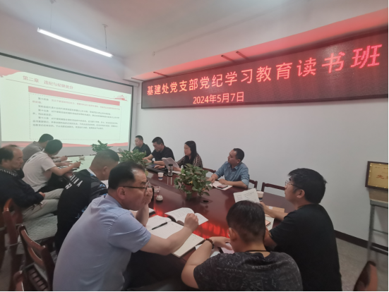 5月7日下午,基建处党支部在会议室召开党纪学习教育读书班专题研讨会,全体党员参加会议。学习研讨活动由党支部书记郭兵主持。