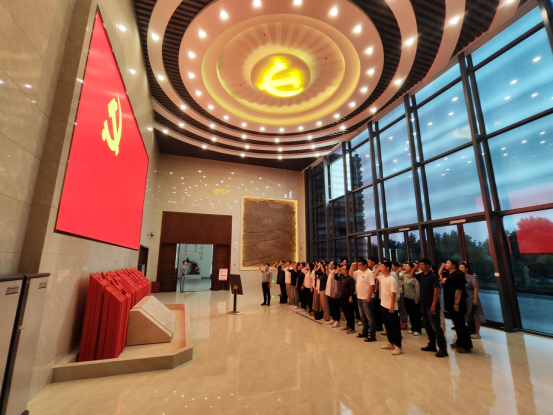 走出展厅,同志们在机关党委书记孙德春的带领下重温入党誓词。大家列队肃立,举起右拳,面对鲜红的党旗,庄严宣誓。铿锵有力的宣誓声,汇聚着不忘初心、牢记使命的坚定决心。